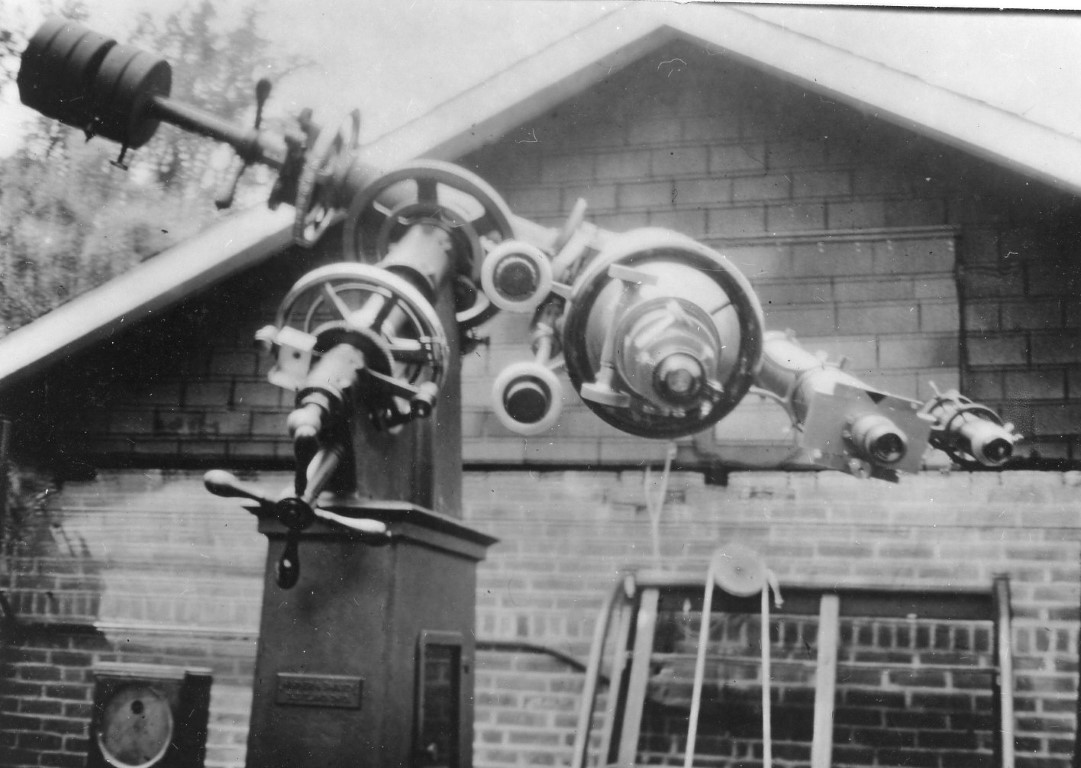 Sometime around 1915 the campus migrated to its current location on North Charles Street. As far as I can determine it was then that the telescope was relocated to a roll off roof observatory. Among our finds in this little observatory were a filar micrometer, a prism spectroscope, a sidereal clock (with a mercury compensated pendulum) and an adjustable observation chair. This chair made it (relatively) easy to get into position under the eyepiece.
