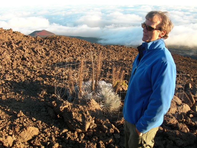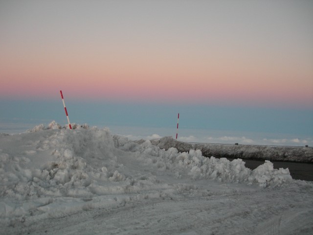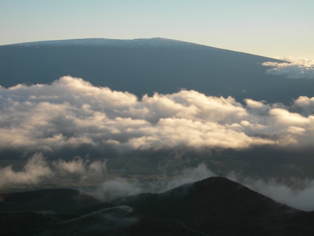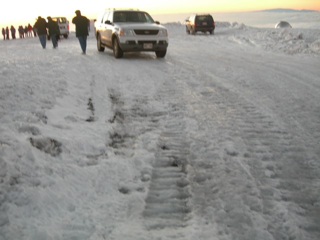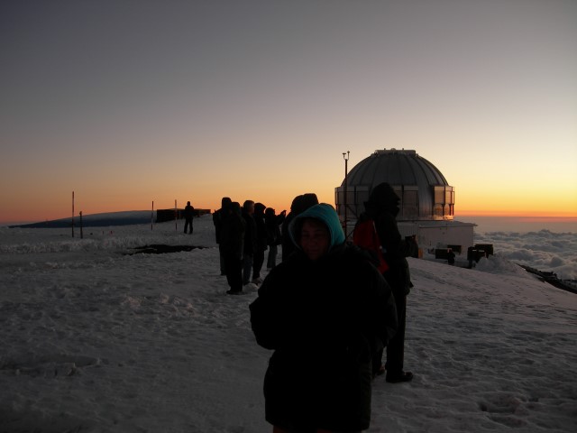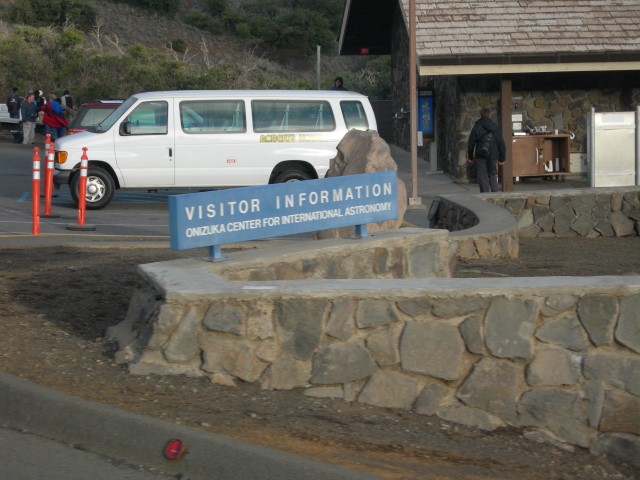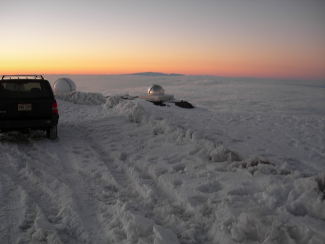 In February 2008 we were in Hawaii on the Big Island and took the opportunity to visit the Mauna Kea summit and the telescopes there. The altitude is 13,800 feet and the climate is about as different from sea level Hawaii as you can imagine. The air is rather thin, there's no jungle vegetation and the overall landscape is more desert than jungle. There's snow on the top and Mauna Kea has the unique distinction of having the only snow plow in Hawaii. In recent years the peak has been home to some of the world's largest telescopes and besides the telescopes it is a special place to visit. It's revered as the place of origin of the Hawaiian people and it is also a dry and high location ideal for optical astronomy. The presence of telescopes in this sacred area has caused some conflict over the years and at the moment there is something of a detente between the astronomers and the native Hawaiians. The summit consists of several different telescopes operated by several different organizations. The entire area is administered by the University of Hawaii. For more details see the links at the end of this page. Because of the altitude and access restrictions we opted for a guided tour. Even if we could have driven up by ourselves we wouldn't have done it. By the time we got the top we were suffering from hypoxia and it was hard to do anything much more than put one foot in front of the other. Our tour began in the morning and included lunch, a visit to the summit, seeing the sunset, and finally returning to the visitor center which is at about 9,000 feet. There we had a chance to do some observing with portable telescopes that our guide brought along. The seeing in this area is just spectacular, even at the lower altitudes and with smaller telescopes. It's easy to see why this is a productive spot for astronomy.