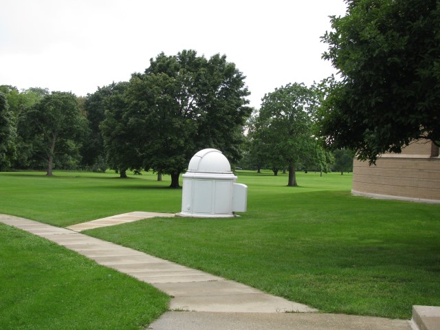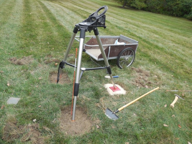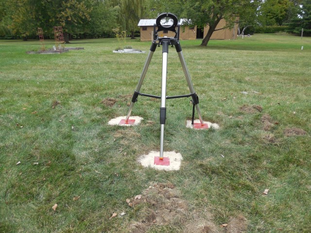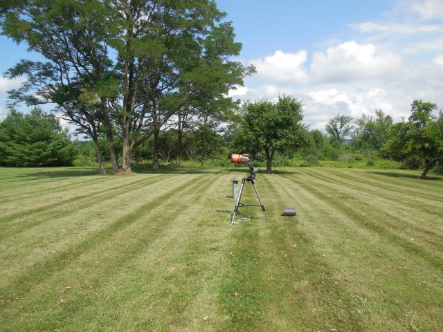 I some observing this way but decided there was a better mounting. After some research I purchased a very sturdy Celestron tripod and the setup doesn't take long. I had thought about a permanent structure like that little dome at Yerkes or the roll off roof at Lowell but eventually decided to keep things portable. One night I did a basic alignment on Polaris and marked the location of the tripod legs. The next day I positioned 3 floor tiles at the locations of the tripod legs. Now I can put the tripod on the tiles and know that the alignment should be pretty good for at least casual viewing.