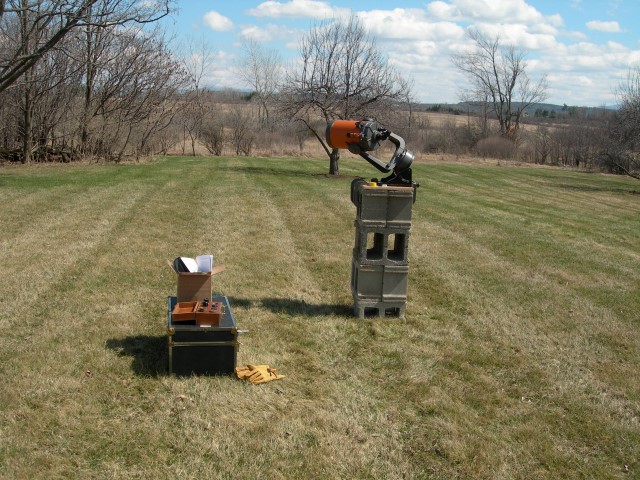 This telescope followed me around for several years until I sold it to the Fairbanks Museum in St. Johnsbury for use at public star parties. It may still be there for all I know. A lot of sweat and thought went into it and there are times now that I miss it. Fast forward about 30 years and my old friend Clay Johnson kindly offered me his classic Celestron C8. Thanks again Clay. It is a significant improvement over that old 6" f/8 Newtonian. Besides having an advanced optical system, SchmidtCassegrain, it has (wonders of wonders) a clock drive and outstanding positioning controls. It's extraordinarily sturdy and easy to use. In spite of the fact that our house is near a lot of light pollution we do get adequate dark skies for deep sky objects. Nothing like you get being in the desert but vivid and entrancing viewing nonetheless. My first attempt at a mounting was a collection of cinder blocks and clamps. It was very sturdy but cumbersome.