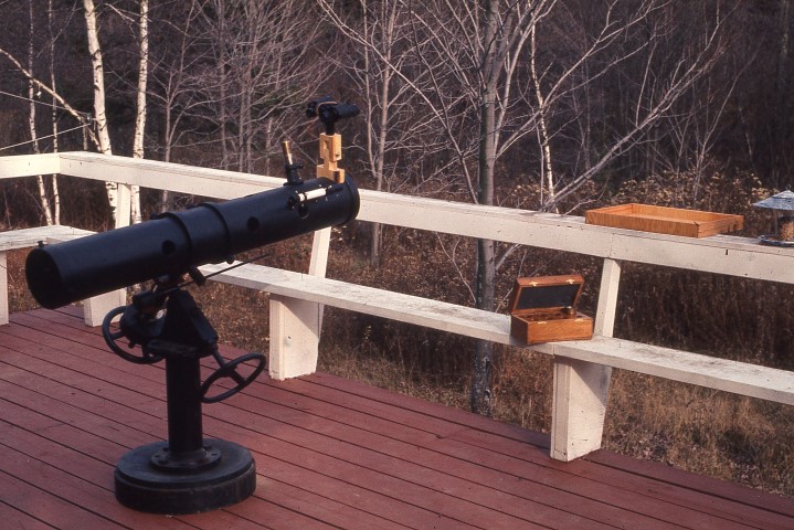 Probably I was in high school when I got my first look through a telescope. A friend had a 4 1/4" Edmund Scientific Newtonian and I think that we got a pretty good look at Saturn. Even though it was in the city the seeing was pretty good that night. I remember thinking that this was SO much better than looking at pictures in a book. Add to that the idea that the light I was seeing came from the Sun, bounced off Saturn and then came right into my eye. That idea of photons traveling that far still gives me shivers. Hopkins gave me a chance to play with a real telescope. Although I didn't take any courses in astronomy I learned a lot from my friends Clay Johnson and John Locke. I am indebted to them to this day for reinforcing my interest in astronomy and helping me to acquire new knowledge and skills outside of the formal undergraduate curriculum that was our normal daily work. Around this time I conceived the idea of having my own telescope and purchased several books on "how to build a telescope". Since this was to be a low budget project (as most of my projects were in those days) I decided to grind my own mirror. Eventually I settled on the traditional Newtonian 6" f/8 design and purchased a mirror grinding kit from Edmund Scientific. It had the mirror, the grinding tool and all the abrasives. Today you can buy a finished mirror but dedicated amateurs will still grind their own. Here are instructions on mirror grinding and they pretty much describe what I did when I made mine. You can still buy the kits. Grinding started around the time I graduated and the mirror was done a year later. Parts from a used mount and tube appeared during graduate school and eventually I was able to cobble together a very sturdy mounting. It must have weighed upwards of 150 lbs and was far from portable but it didn't wobble. There was no clock drive so guiding by hand was the order of the day. The only pictures I ever took with it were short exposures of the Moon. No stars, planets, or deep sky objects. Here are two views of the scope: