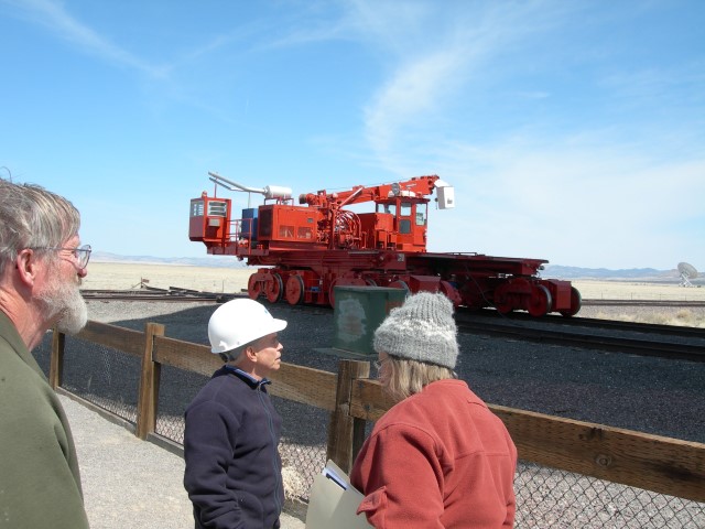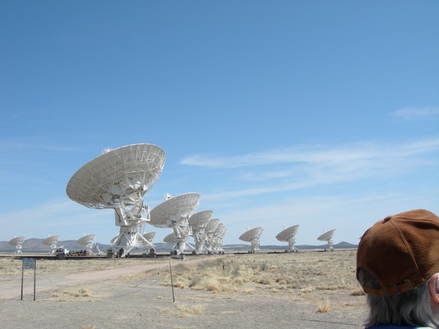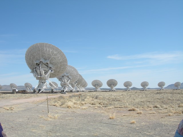 It is operated by the National Radio Astronomy Observatory and consists of 28 movable dish antennas. They move along 3 railroad tracks and can be configured to be close together for high resolution or further apart of maximum sensitivity. Two of the tracks are 13 miles long and the other is 11 miles long. Here is some technical data about the antennas. The dish antennas are about 85' across and when you have 28 of them all together the total effect is stunning. Here are some images that we took.