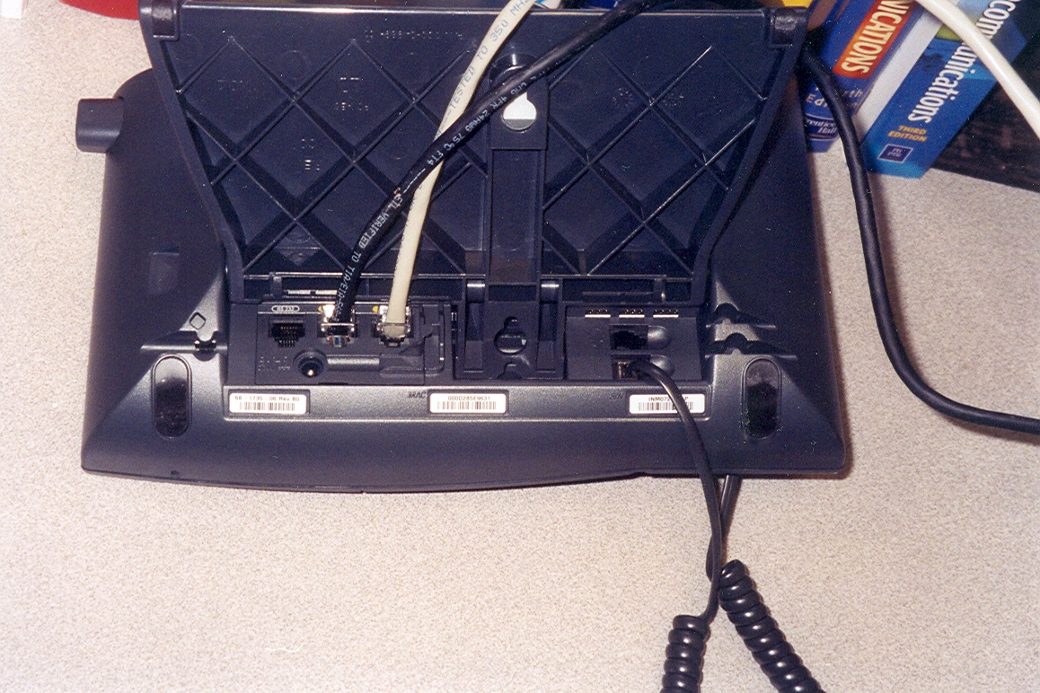 The connection to the network is via a high speed Ethernet data connection located on the bottom. It's a conventional RJ-45 plug with some CAT-5 cabling. You'll see that there are two connections in the photo,. One connection goes to the network and the other to a PC. In this case the phone is acting like a network hub for a PC. This arrangement should convince you that in the VoIP world data packets and voice packets are just collections of bits to be moved over a common network.