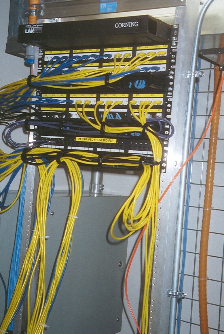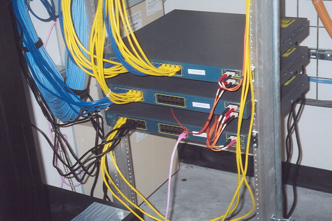 The router is going to connect the building's telephones to the campus backbone. In this photo the backbone connections are made via fiber optic cables and these are the small orange cables on the right side of the routers.