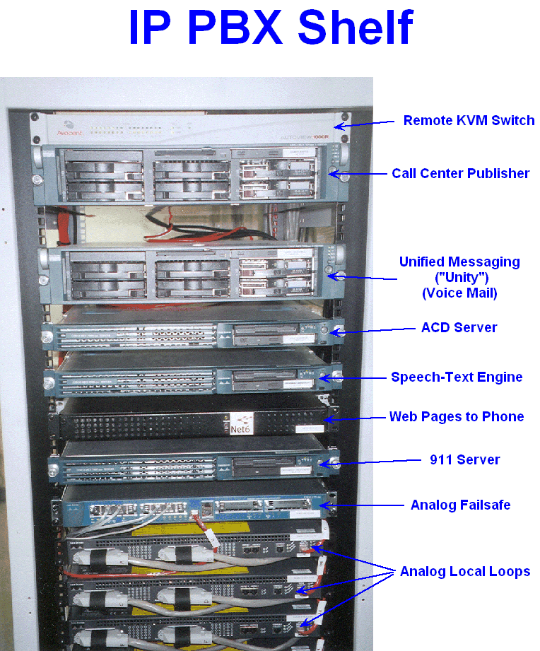 Eventually the data backbone is going to end up at a central point where the voice network is managed. You can think of this as a VoIP PBX system since it's here that you'll find the boundary between the local data network and the PSTN and/or Internet. Here's an annotated photo of the VoIP PBX rack.