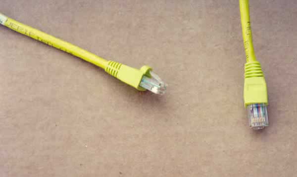 Each office in West Hall as a RJ-45 outlet plate. A PC with a NIC card can plug into one of these jacks. The other end of the jack terminates in a patch panel in the basement. A patch cable is used to connect a port on the hub to a jack in an office. For example, note the path of the green wire between a jack on the hub at the bottom and an office jack at the top. There's also a close-up of a RJ-45 patch cable.