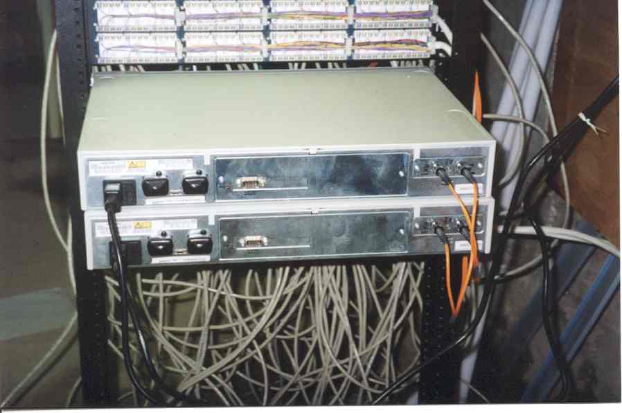 West Hall connects to the campus network by some fiber optic cables. They are the orange cables on the right of the hubs. Note that each hub has two fiber optic cables, one for transmitted data and one for received data.