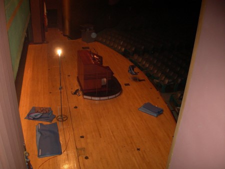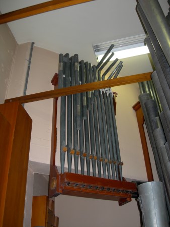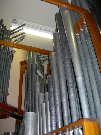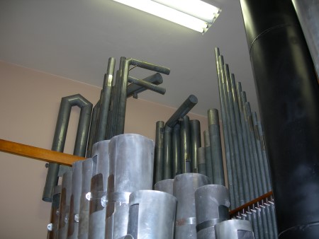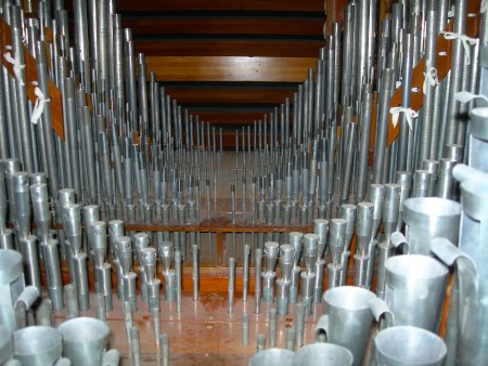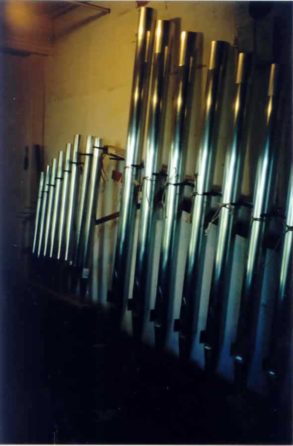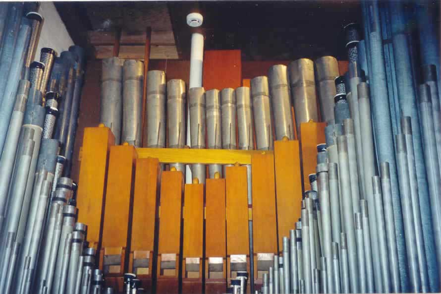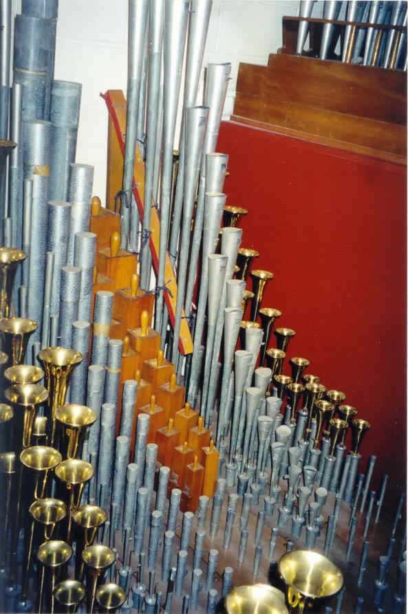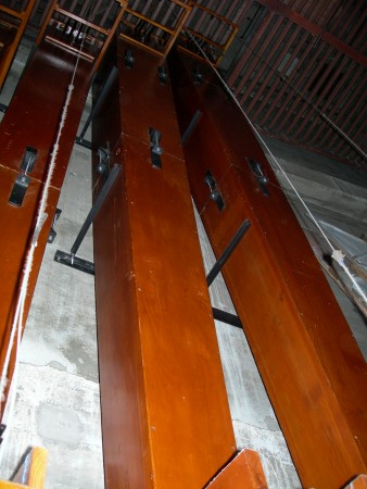 Now a view down from the stage house and the big 32' diaphones on the back of the stage. There are only 6 of these pipes but they play a full octave by a trap door on top that shortens the length of the pipe. No, you can't play C and C# at the same time.