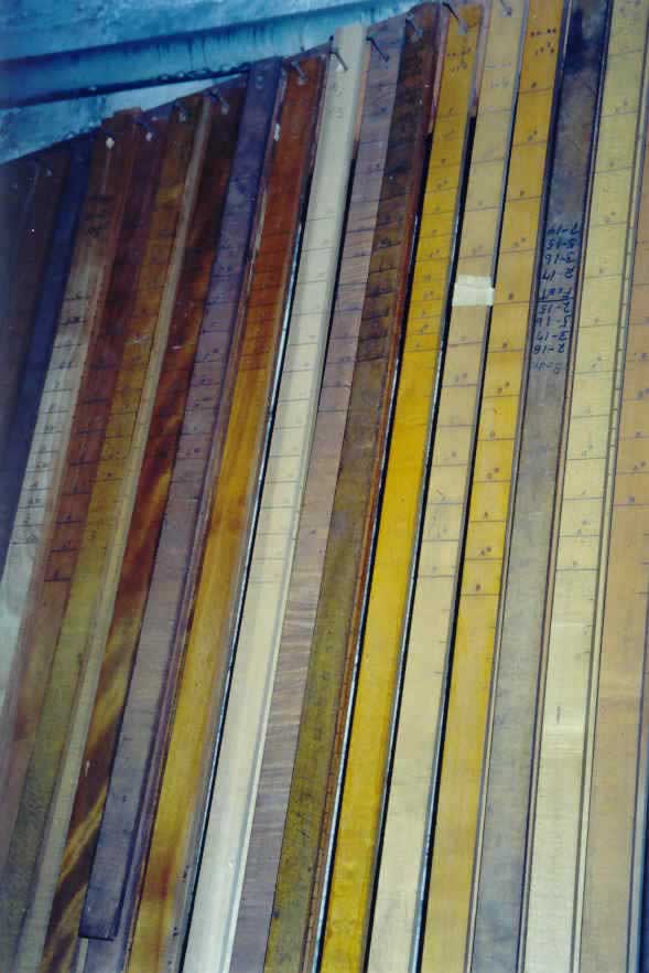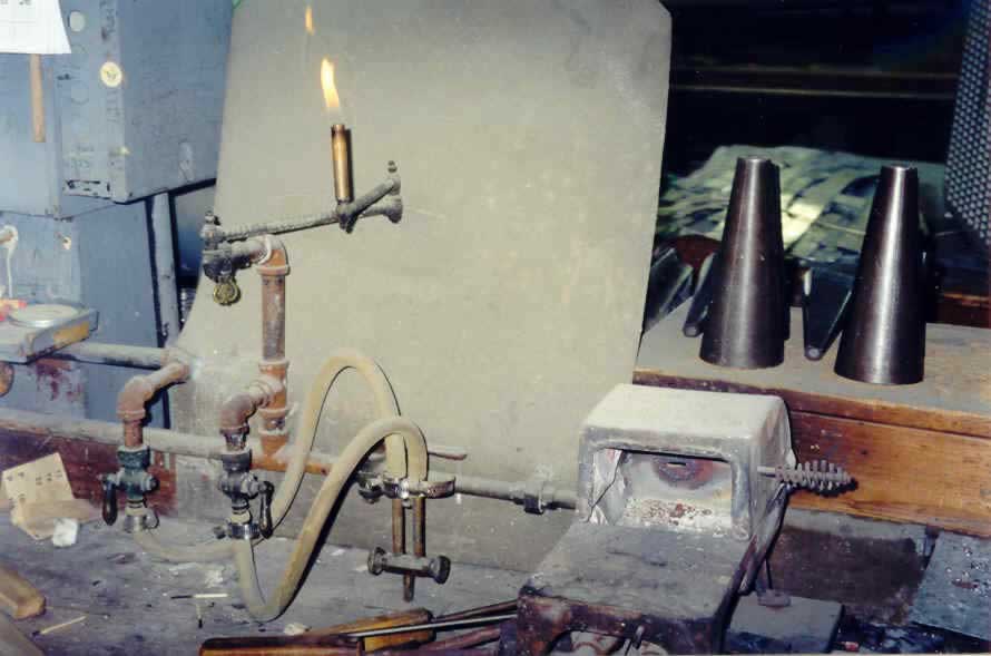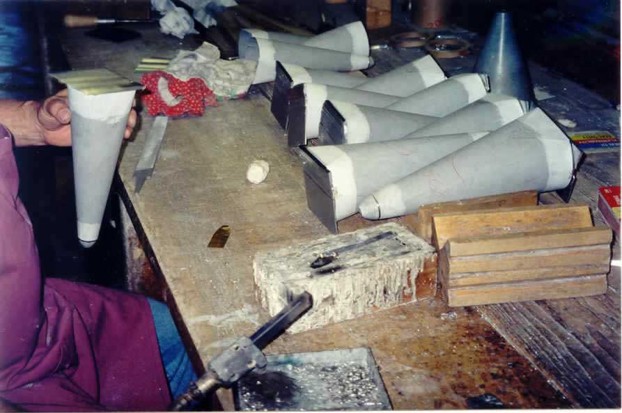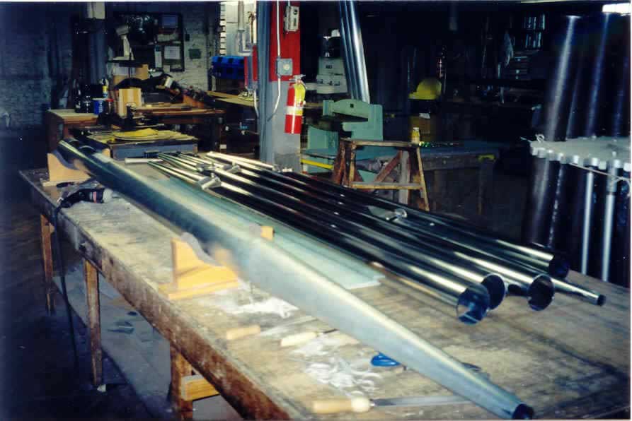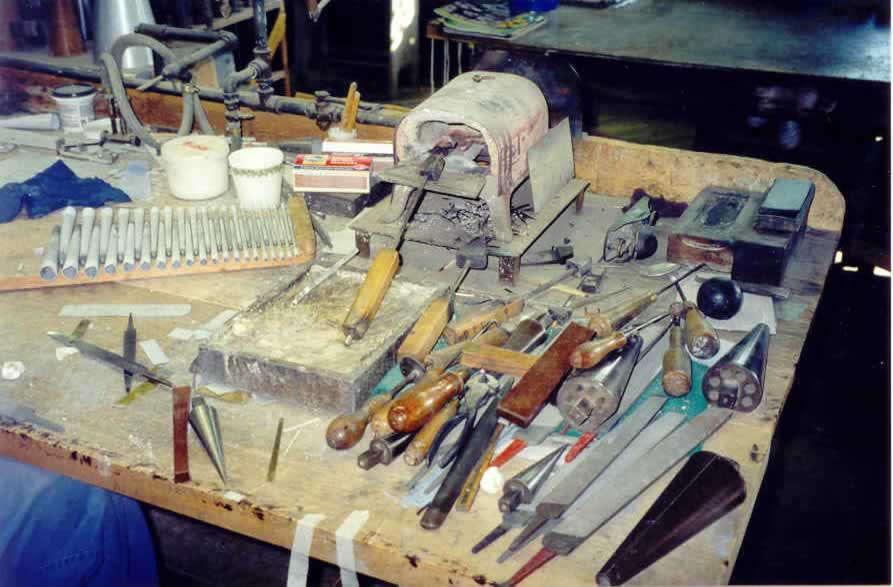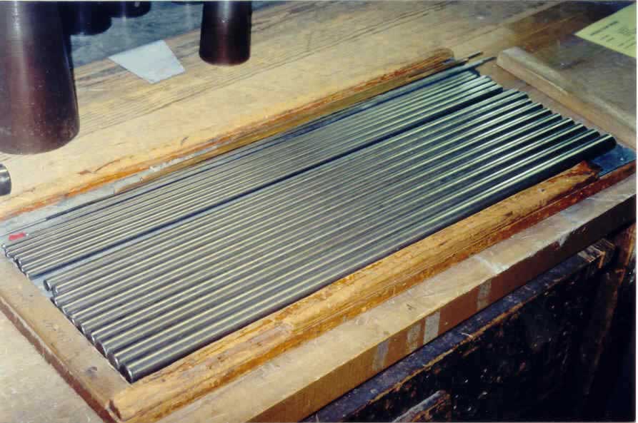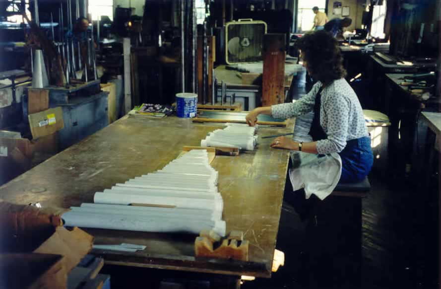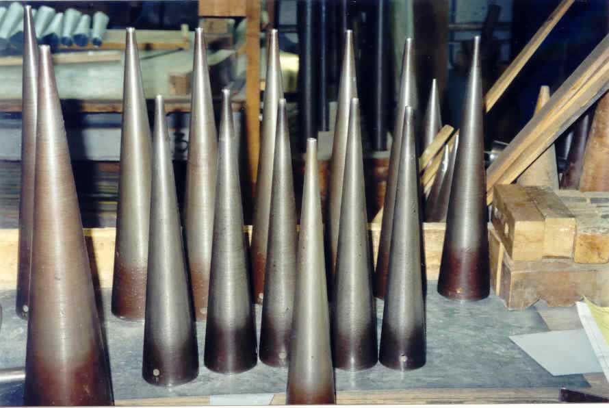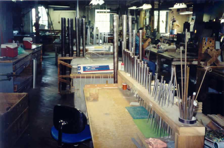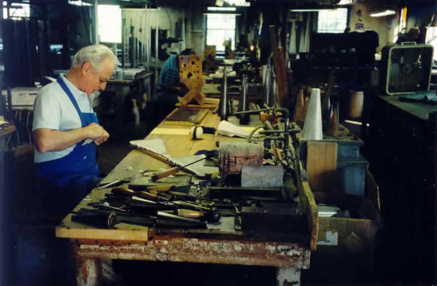 Eastern Organ Pipes Now for a tour around Eastern Organ Pipes. The first few shots are of the exterior. This building was once occupied by the M.P. Moller organ company and you can get an idea of the size of the operation. Eastern Organ Pipes occupied only a small fraction of that space. Note the erecting room in the middle. This was a very large space in which pipe organs were completely assembled and tested prior to shipping. After a fire EOP closed. The first step in making a metal organ pipe is to prepare the appropriate mixture of lead, tin, zinc and other metals. Different combinations of metal produce different sounds and it's quite an art to get to the right composition. The metals are mixed in the casting room and then spread out on a flat table while still molten. Here are some of the patterns used to lay out the pipe components. These were purchased along with many of the tools when Moller went out of business and the tools were auctioned off. Some of mandrels for round pipes and conical pipe feet. Note the traditional pipe making techniques and tools. Pipes that are undergoing final finishing and voicing. Berkeley Community Theater. This performing arts space is home to a large 4/41 Wurlitzer which is maintained by the NorCal chapter of the American Theater Organ Society. These images were made with a pocket camera and aren't of the highest quality. Look at their web site for some better pictures. The console originally came from the Center Theater organ in Rockefeller Center. Before coming to Berkeley the organ played in the American On Wheels skating rink in Alexandria, VA. It was owned by Jimmy Boyce and I used to go there, lean on the console, and watch him play. The first image below was sort of what it was like. Imagine me about 40 years younger.