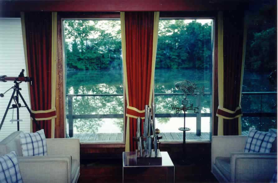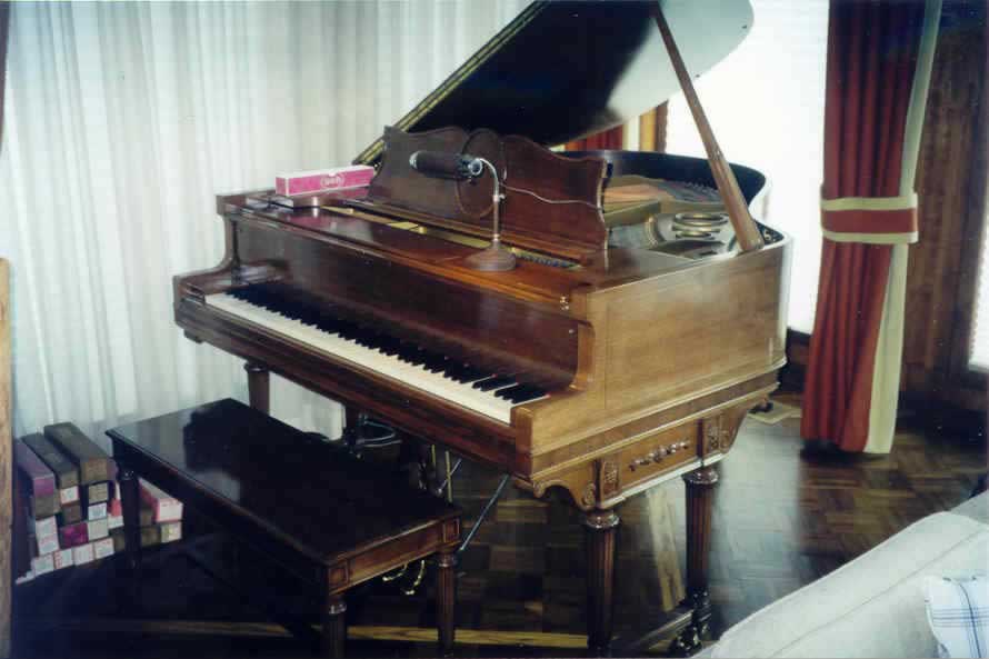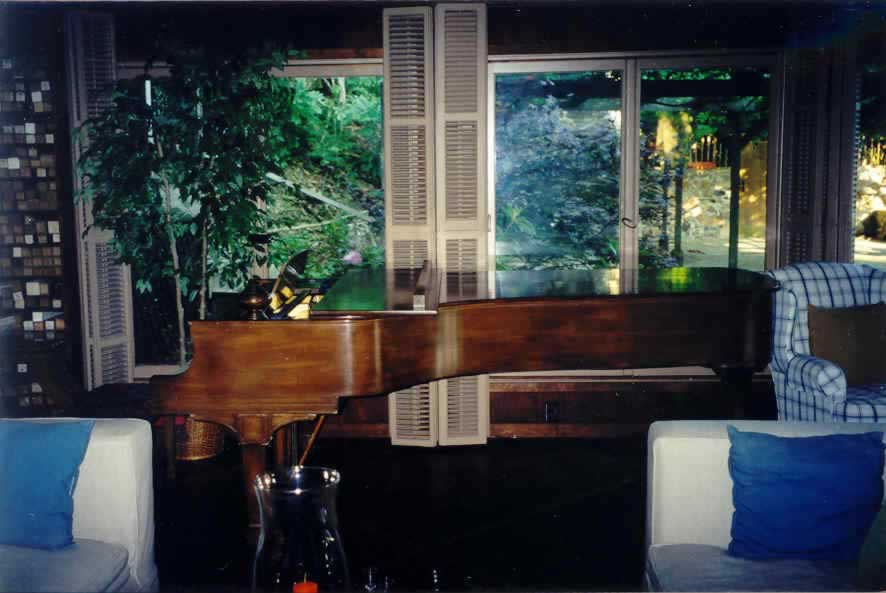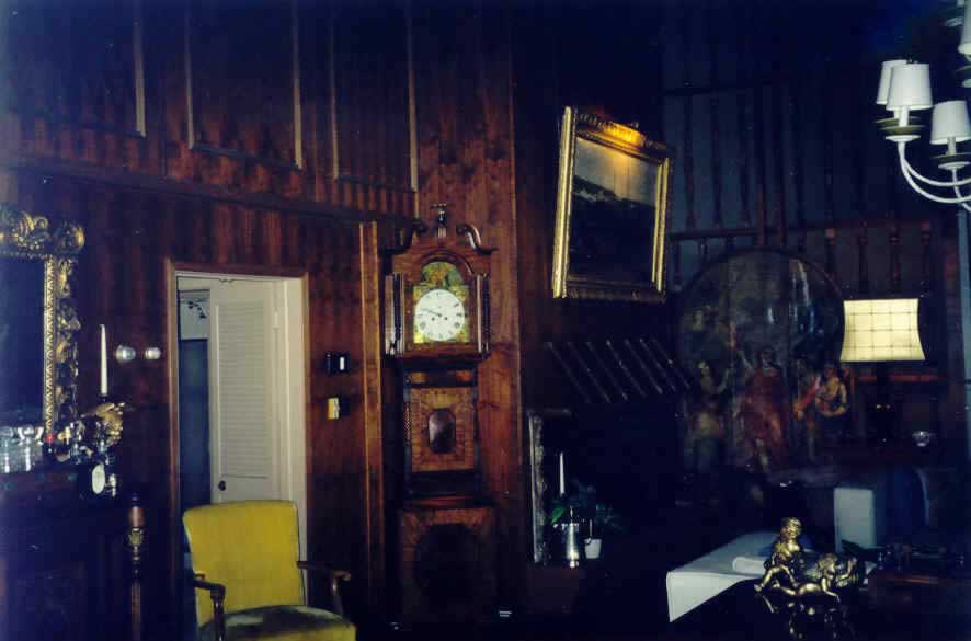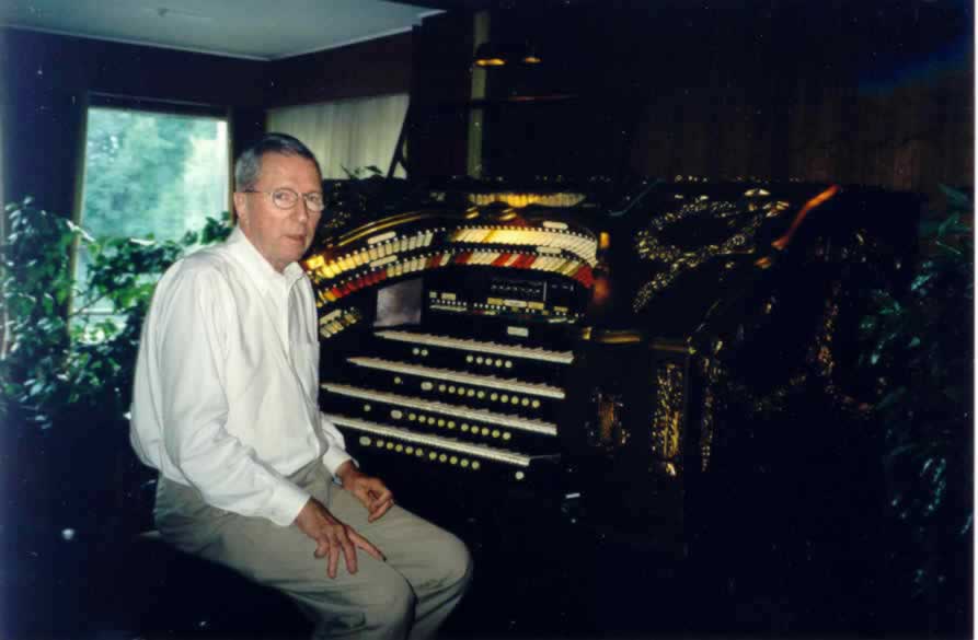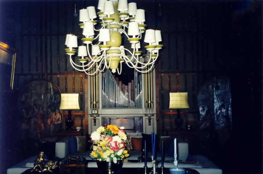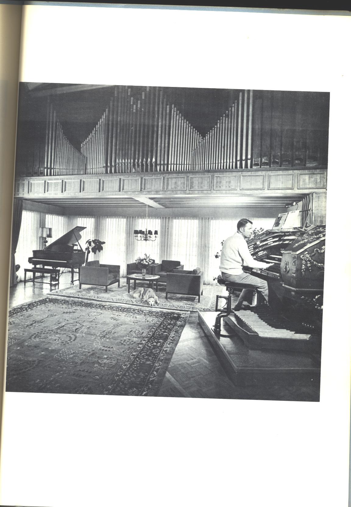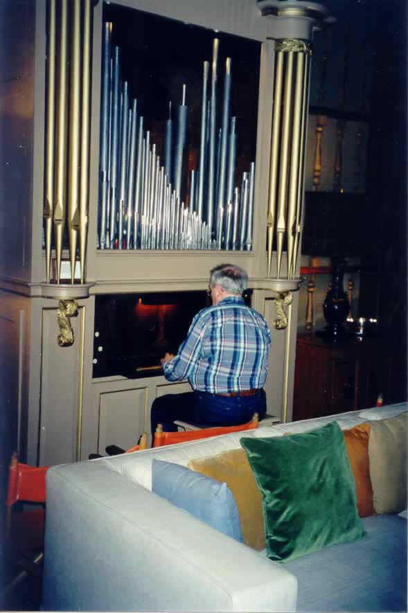 Next are two views of Dick at home. These are some views of the pipe chambers. Here's the late Ray Brubacher at the console of the Wurlitzer, in one of the chambers, and playing the small tracker pipe organ at the other end of the music room. Yes, Dick had two pipe organs in one room! There was a Weber DuoArt reproducing piano that was playable from the Wurlitzer console. These are some views around the listening room. The one one on the left is from a concert program done in the 1970s. The greyhound is Julie. I'm at the console in the last image.