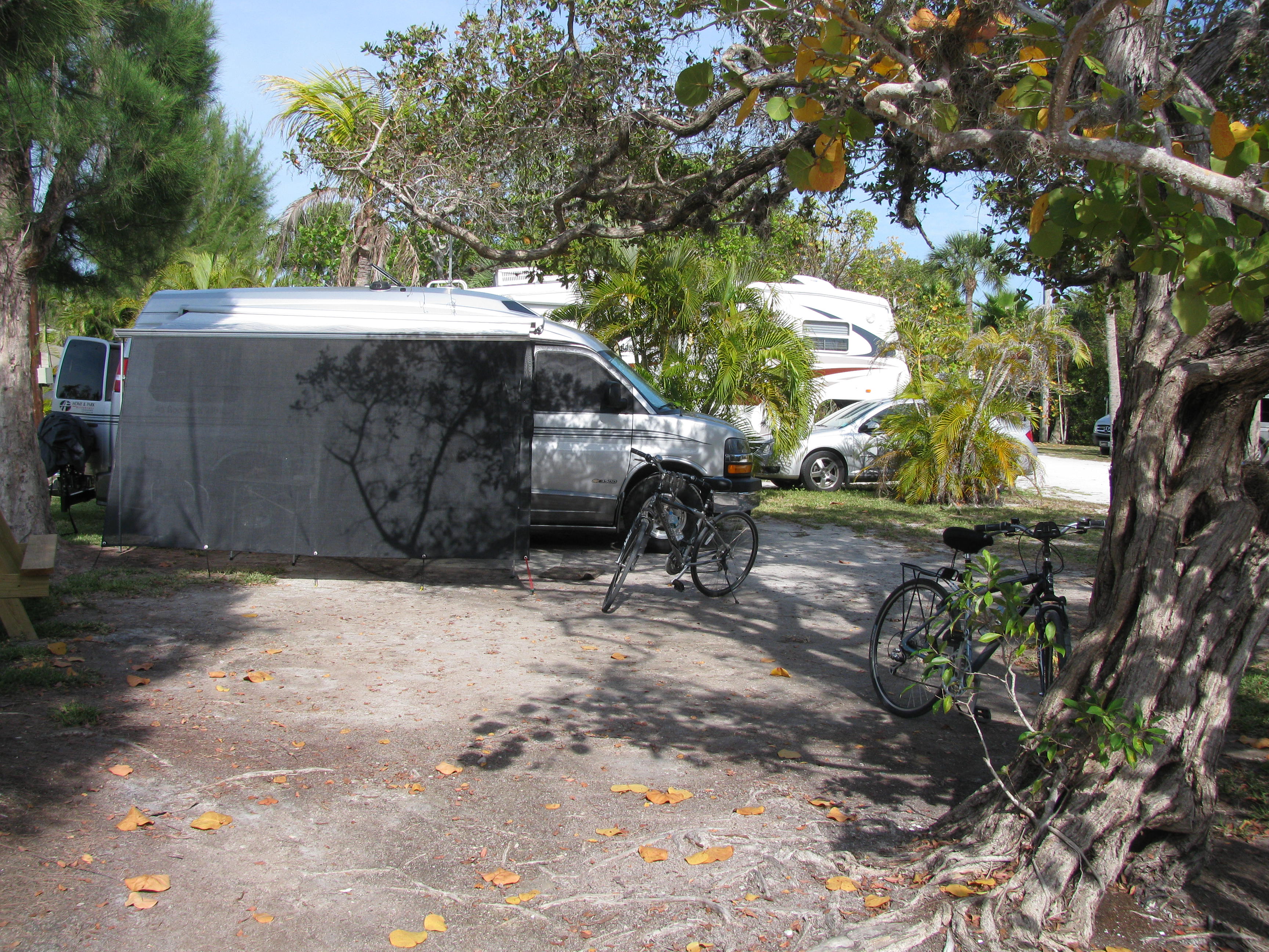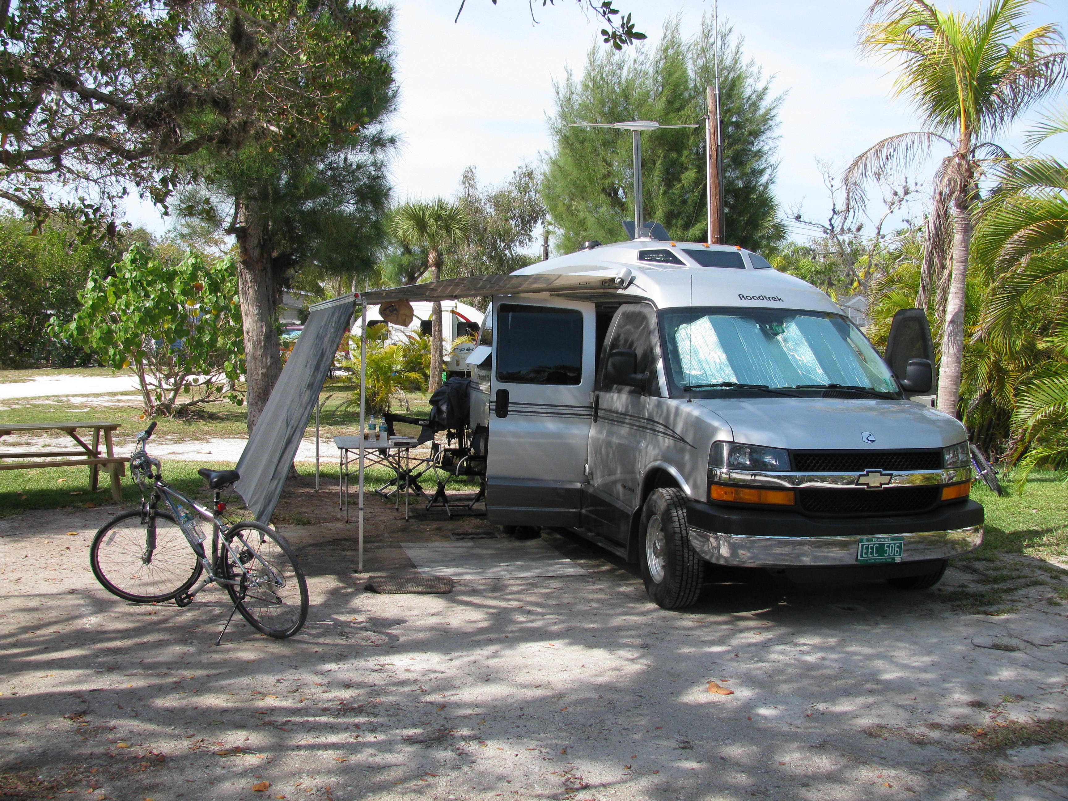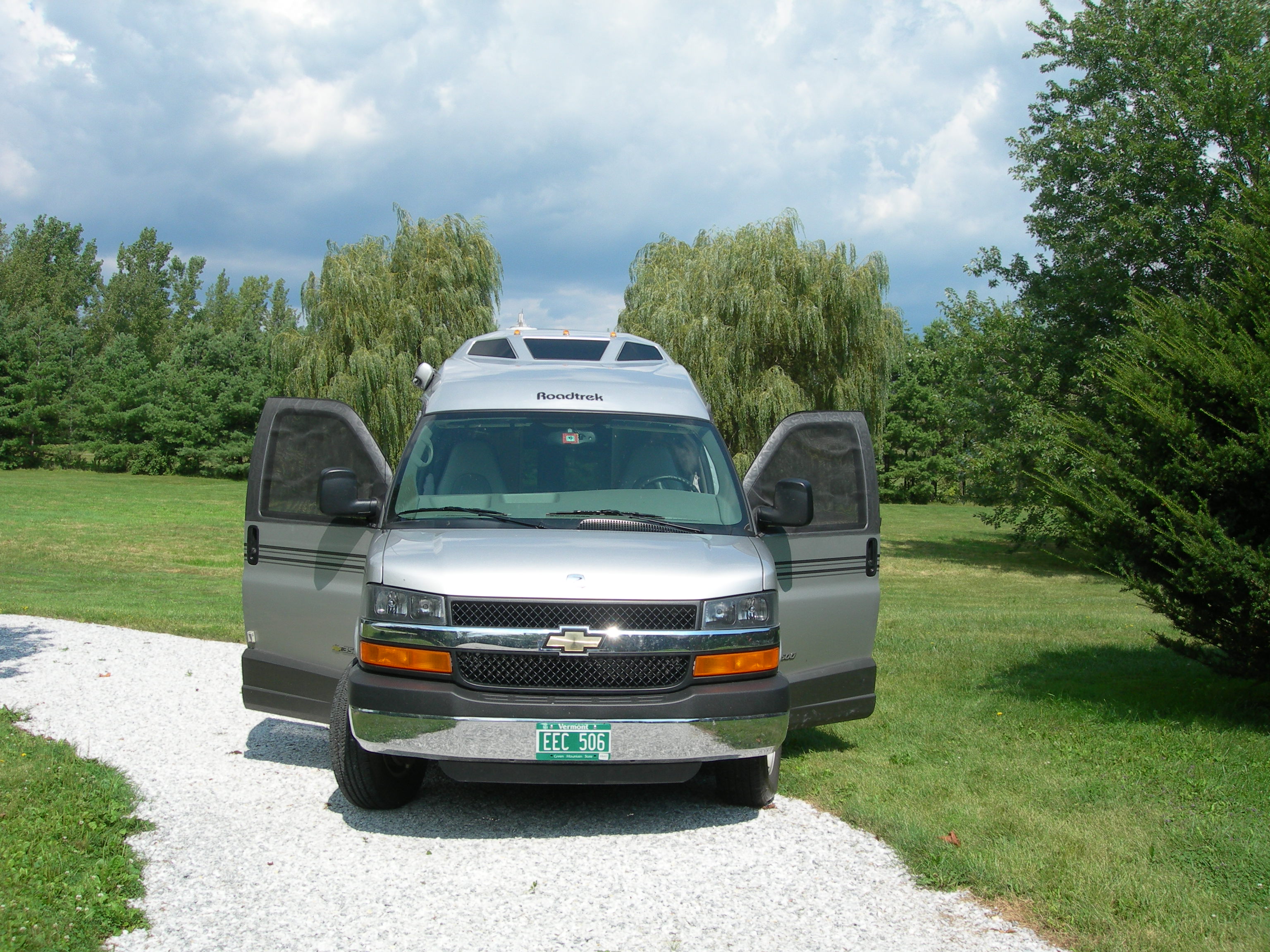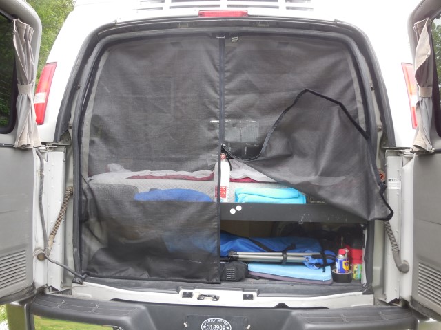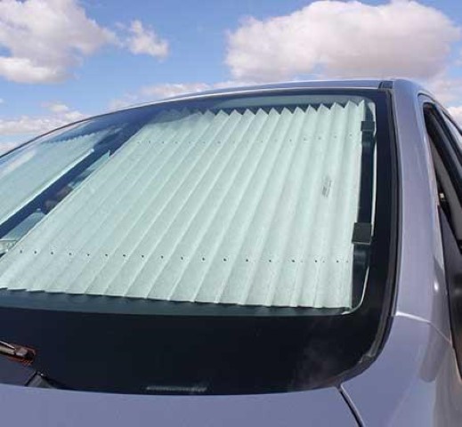 Products We Like Here are some of the products that we've found useful. These are the result of lots of experimentation and trying out different things. Note that there's some overlap in coverage with the topics covered in "Modifications" on our Roadtrek page. When we purchased our Roadtrek we bought the standard screen package for the rear doors and the side door. We added after-market screens to the front doors. These are custom made and cost about $72 for the pair including shipping. No need to measure: just send Chuck the make and year of your van. Contact: Chuck Blethen. Web site is http://www.skreenz.com/. When our original rear screen developed some holes and tears we got a replacement from Chuck. Initially the cost was a bit daunting: about $340 but it was cheaper than any other vendor AND the quality is excellent! Chuck always provides excellent products and fantastic customer service. It is very tough and has worked out much better than the OEM screen. Another screen option that we found complements the Fiamma awning. When we're camping in a warm climate and staying for a few days we'll put out the awning. One great awning accessory that we found is a screen that slides into the Fiamma awning and extends to the ground. It's held in place with tent stakes at the bottom. The screen has small holes and is porous: air gets through but sunlight is (mostly) blocked. It creates a nice outdoor living space. We had trouble finding just the right screen and we eventually got one at RV Sunscreen in Winterhaven, FL. I haven't been able to connect with them but Amazon has a number of offerings that might work for you. Another highly recommended screen is one made for the windshield by Eclipse Sunshades. These are corrugated fabric and rest in brackets on either side of the windshield. When you're parked you pull them together in the middle and they stick together with Velcro. They're great for privacy when camping too. https://eclipsesunshades.net/ Here's an image from their web site: